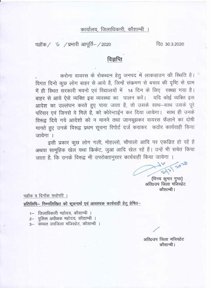 कौशाम्बी। जनपद में गैर प्रान्त व् जिलों से चलकर घर पहुंचने वाले लोगो को क्वेरेन्टाईन सेंटरों में रहने के सख्त निर्देश जिला प्रशासन ने जारी कर दिए है। सोमवार को जिला प्रशासन ने एक विज्ञप्ति जारी कर वाइरस के प्रति लापरवाही बरतने वालो लोगो कर कड़ी कार्यवाही की बात कही है। नगरीय व् ग्रामीण क्षेत्र के सरकारी भवनों व् स्कूल को क्वेरेन्टाईन सेंटर के रूप में विकसित किया गया है। जिसमे गैर जनपद, प्रान्त से आने वाले लोग 14 दिनों तक रहकर खुद को आइसोलेट करेंगे।