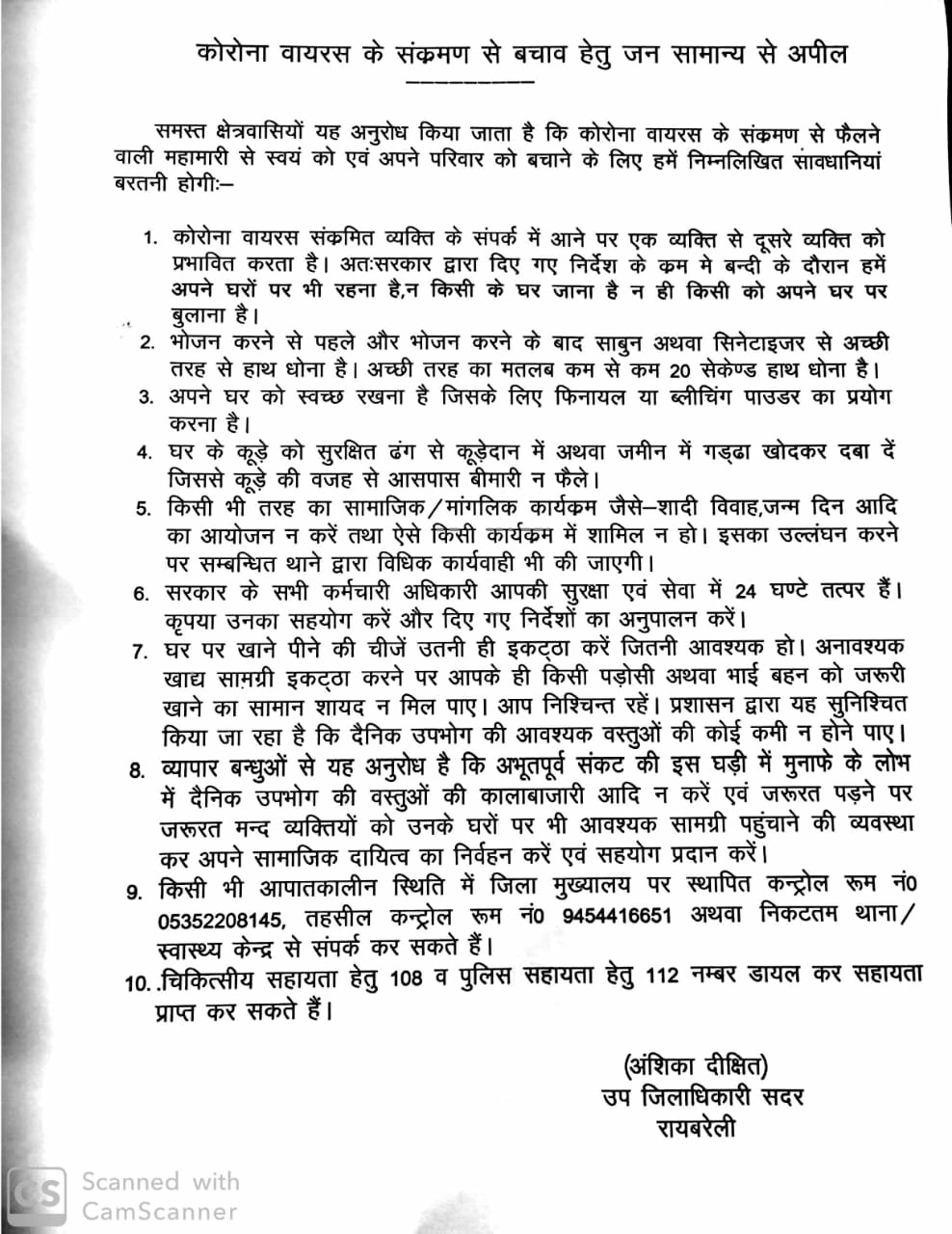रायबरेली- कोरोना वायरस के संक्रमण से बचाव हेतु जन सामान्य से उप जिलाधिकारी सदर अंशिका दीक्षित ने किया अपील। कोरोना वायरस के संक्रमण से फैलने वाली महामारी से स्वयं को एवं अपने परिवार को बचाने के लिए निम्नलिखित सावधानी बरतने की अपील की है।