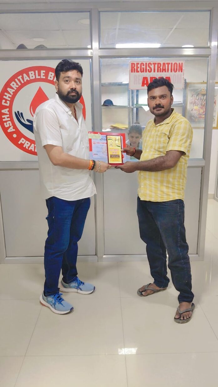 प्रतापगढ़ –पवन पैथोलॉजी प्रतापगढ़ के संचालक पवन यादव निवासी महुली चिलबिला प्रतापगढ़ द्वारा एबी पॉजिटिव रक्त की कमी के चलते सूचना मिलने पर तत्काल आशा चैरिटेबल ब्लड सेंटर बालीपुर प्रतापगढ़ के रक्त केंद्र जाकर अपना एबी पॉजिटिव का स्वैच्छिक रक्तदान किया गया। ब्लड बैंक के संचालक अमित सिंह द्वारा रक्तदाता को प्रशस्ति पत्र एवं मोमेंटो देकर सम्मानित किया गया। ब्लड बैंक संचालक में रक्तदाता की प्रशंसा करते हुए कहा कि आप जैसे रक्तदाताओं की वजह से ही रक्त केंद्र में रक्त की कमी नहीं होने पाती है जिसके चलते जरूरतमंद मरीजों को समय पर रक्त उपलब्ध करवा कर उनका जीवन बचाने का सौभाग्य प्राप्त होता है।