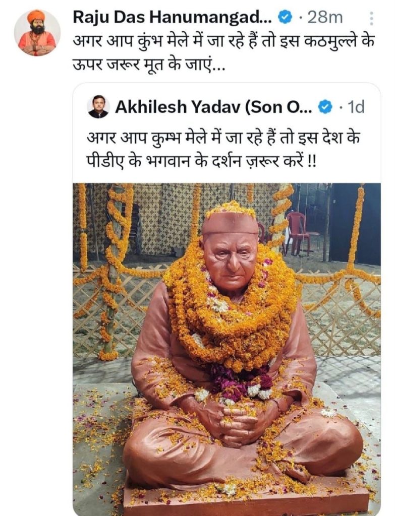 - यह कि हनुमानगढ़ी अयोध्या के तथाकथित महंत राजू दास ने समाजवादी पार्टी के संस्थापक, उत्तर प्रदेश के पूर्व मुख्यमंत्री, भारत के पूर्व रक्षामंत्री, पिछड़ो, वंचितो, किसानो, मजदूरों, नौजवानों के मसीहा व लोकतंत्र तथा संविधान में आस्था रखने वाले आम जनमानस के रहनुमा मुलायम सिंह यादव की कुंभ मेले में लगे मूर्ति पर टिप्पणी करते हुये अपने एक्स हैण्डल पर दिनांक 20.01.2025 को लिखा कि “अगर आप कुम्भ मेले मे जा रहे हैं तो इस कठमुल्ले के उपर जरूर मूत के जाए….” और बाद में उनके उक्त बयान पर जब लोगो ने आपत्ति दर्ज कराया और माफी मांगने को कहा तो उन्होने माफी मांगने से इन्कार कर दिया।