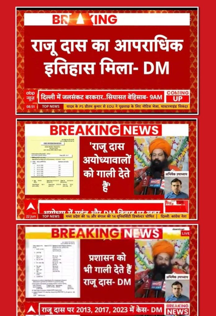 - यह कि तथाकथित महंत राजू दास के उक्त अमर्यादित व भड़काउ व अलगाववादी टिप्पणी से प्रार्थी सहित राजेश यादव, अवधेश अम्बेडकर, डा० संजय सोनकर, राहुल यादव, कमलेश, आनन्द, आशीष, राजेश, जितेन्द्र विश्वकर्मा, सत्य प्रकाश सहित लाखो लोगो कि भावनायें आहत हुई है। जिससे समाज में आकोश, अलगाव व रोष का माहौल बना हुआ है।