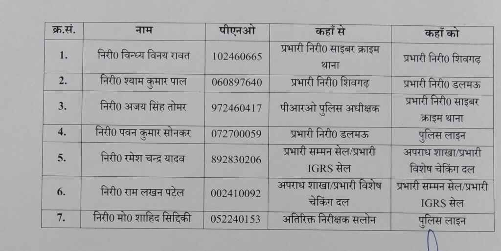 रायबरेली-रायबरेली में एक बार फिर पुलिस अधीक्षक डॉ यशवीर सिंह ने थाना अध्यक्षों के तबादले व दो उप निरीक्षको व एक थाना प्रभारी को लाइन हाजिर कर दिया है। एसपी ने देर रात आधा दर्जन निरीक्षकों के कार्य क्षेत्र में बदलाव किया है। थाना प्रभारी शिवगढ श्याम कुमार पाल को थाना डलमऊ प्रभारी बनाया गया है। थाना प्रभारी डलमऊ रहे पवन कुमार सोनकर को लाइन हाजिर कर दिया है, पुलिस अधीक्षक पीआरओ अजय सिंह तोमर को प्रभारी साइबर क्राइम बनाया है, रमेश चंद्र यादव को सम्मन सेल प्रभारी से हटाकर अपराध शाखा का प्रभारी बनाया गया है,अतिरिक्त निरीक्षक सलोन रहे मो शाहिद सिद्दीकी को लाइन हाजिर कर दिया है,निरीक्षक राम लखन पटेल अपराध शाखा प्रभारी को प्रभारी सम्मन सेल बनाया गया है ।