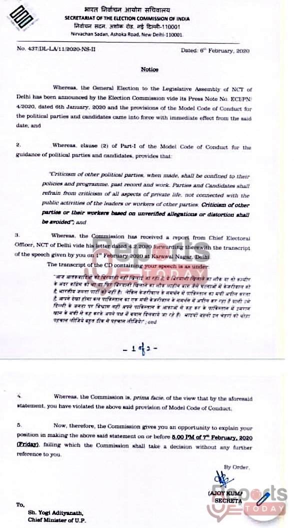 दिल्ली चुनाव प्रचार मे मुख्यमंत्री योगी आदित्यनाथ ने अरविन्द केजरीवाल पर आरोप लगाया था की वे शाहीन बाग़ मे #CAA के खिलाफ बैठे लोगों को बिरयानी ख़िला रहे है, इसी बात के ख़िलाफ़ आम आदमी पार्टी ने चुनाव आयोग से शिकायत की थीचुनाव आयोग ने मुख्यमंत्री योगी आदित्यनाथ से 7 फरवरी शाम 5 बजे से पहले जवाब देने को कहा है।