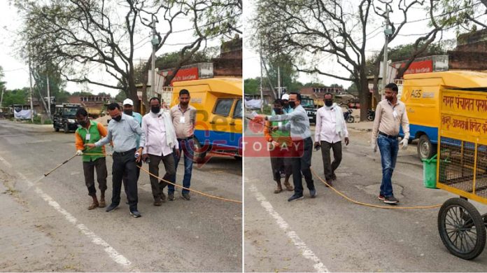 परशदेपुर (रायबरेली)। आदर्श नगर पंचायत परशदेपुर में कोरोना वायरस के संक्रमण से बचने के लिए प्रशासन द्वारा लगातार प्रयास किये जा रहे हैं।इसी प्रयास के क्रम में नगर पंचायत के अधिशासी अधिकारी संजय शुक्ला ने शुक्रवार को अपने कर्मचारियों के साथ खुद ही सड़को पर निकलकर दवाओं को छिड़ककर सड़को को सेनेटाइज़ किया और अपने कर्मचारियों को दवा छिड़कने का सही तरीका बताया।सेनेटाइज करने के दौरान नगर पंचायत के बिन्देश्वरी प्रसाद बाबू, अफ़ज़ल खान,सरवन सोनकर सफाई नायक साथ मे मौजूद रहे।अधिशासी अधिकारी ने बताया कि जब से कोरोना वायरस का प्रकोप शुरू हुआ है तब से लगातार नगर को सेनेटाइज़ करने का कार्य कराया जा रहा है। इसके अलावा लोगो को नगर पंचायत की तरफ से लगातार साफ सफाई के लिए जागरूक किया जा रहा है और लोगो को लॉक डाउन का पालन करने की हिदायत दी जा रही है।