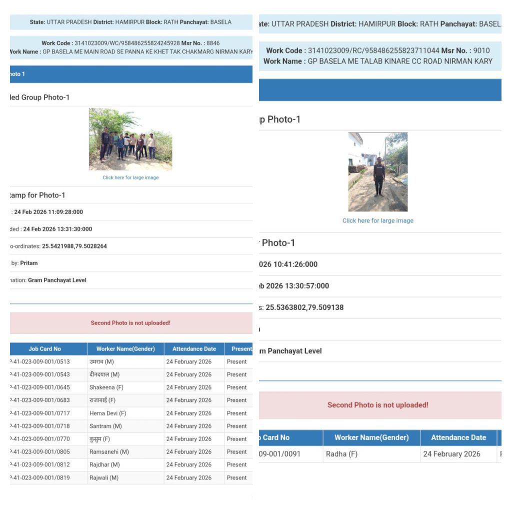तारीख 24/02/2026 को बसेला में मनरेगा कार्य के दौरान मस्टर रोल संख्या 8846 जारी हुआ। इस रिकॉर्ड के मुताबिक, मौके पर 4 महिला श्रमिक पसीना बहा रही थीं। लेकिन जब ‘नेशनल मोबाइल मॉनिटरिंग सिस्टम’ (NMMS) पर अपलोड की गई सरकारी फोटो को जूम करके देखा गया, तो प्रशासन के दावों की पोल खुल गई।