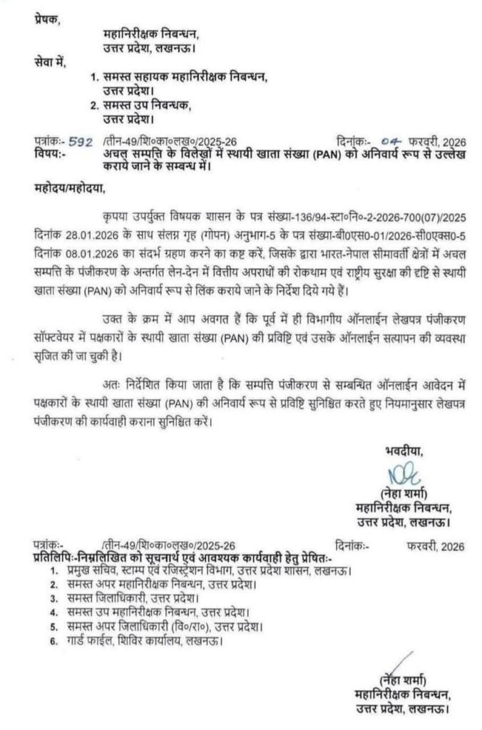 UP Property Registry: यूपी में अब जमीन, मकान या कोई भी प्रॉपर्टी खरीदना पहले जैसा नहीं रहा. योगी सरकार ने रजिस्ट्री के नियमों में बड़ा बदलाव कर दिया है. अब अगर आपके पास PAN कार्ड नहीं है, तो आप उत्तर प्रदेश में कोई भी अचल संपत्ति (Immovable Property) नहीं खरीद पाएंगे. रजिस्ट्री विभाग ने इस संबंध में नए आदेश जारी कर दिए हैं.यह नियम विशेष रूप से नेपाल से सटे उत्तर प्रदेश के जिलों जैसे गोरखपुर, महाराजगंज, सिद्धार्थनगर, बलरामपुर, श्रावस्ती, बहराइच, लखीमपुर खीरी आदि में लागू किया गया है. इन क्षेत्रों में संपत्ति रजिस्ट्री के दौरान आधार सत्यापन के साथ अब PAN की जांच भी अनिवार्य होगी. यदि कोई पक्षकार PAN प्रस्तुत नहीं कर पाता, तो उसकी रजिस्ट्री संभव नहीं होगी.